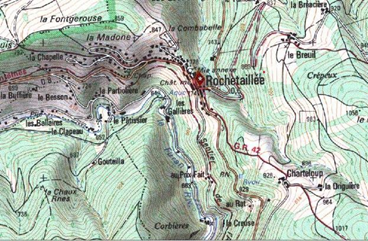 Cette approche terrienne des possessions du baron, dans le contexte de l’ancien régime, consacre un ensemble de terres, soit imbriquées à la paroisse de Rochetaillée, efficiente au XVe siècle, soit bordant des limites seigneuriales voisines. On a ainsi comme voisins des propriétés de plusieurs types, soit ecclésiastiques dans la partie méridionale de la vallée du Furan à l’échelle des terres appartenant à l’abbaye de Valbenoite, soit laïcs au contact du marquis de Saint- Chamond , ou du comte de Charpin feugerolles . Pour autant, la région de Rochetaillée a des rapports d’échanges réguliers avec le village, structurant ainsi une approche géographique centre-périphéries. Ainsi, on valorise des limites géographiques dans l’étude régionale entre la vallée du Furan et le Gouffre d’Enfer, des relations aux versants de moyenne montagne, marqués par des toponymies, symbolisant la complexité des enjeux temporels catholiques à l’exemple de la Chapelle, de la Madone, mais également un ensemble d’hameaux dans les périphéries du village, comme le Breuil. En s’appuyant dès lors sur les repères de la carte I.G. N, on perçoit un champ d’étude régionale, associé globalement à la forme géométrique d’un triangle entre topographies et toponymies variables. On a des riches legs civilisationnels complexes entre temporalités, cultures et lieux cultuels de catholicité.
